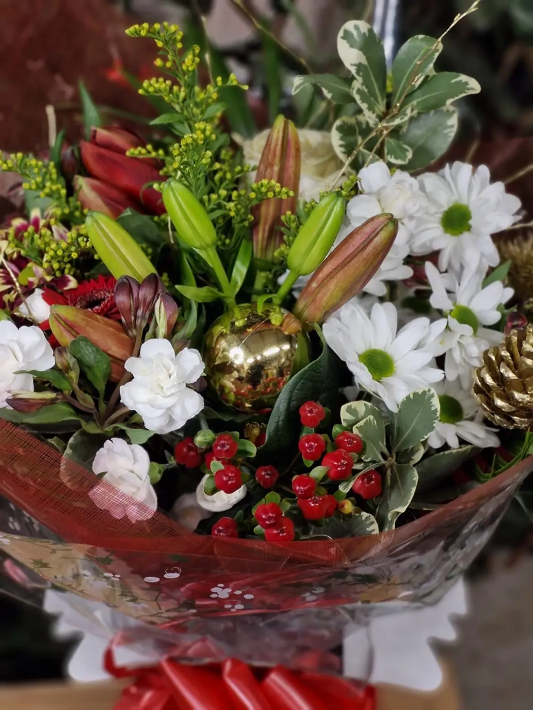 Bring festive cheer to any home with our Christmas Cracker, a luxurious bouquet that embodies the magic of the season. This stunning arrangement features a vibrant mix of red, green, and gold blooms, expertly arranged and placed in a bubble of water for lasting freshness. Presented in a beautiful gift box, it’s the perfect way to brighten someone’s Christmas, whether as a thoughtful gift or a festive centrepiece.