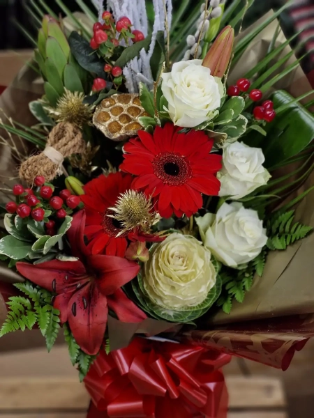 Our Festive Deluxe Bouquet is a carefully crafted selection of seasonal blooms in rich shades of red, green, and gold. Each flower is thoughtfully arranged in a bubble of water to ensure lasting freshness, and presented in a beautifully elegant gift box. The perfect way to spread Christmas cheer, this deluxe bouquet adds a touch of festive luxury to any occasion.
