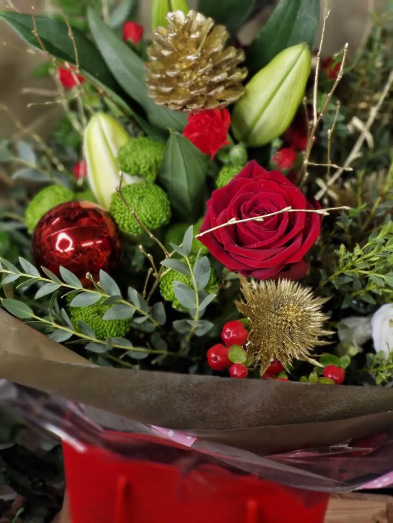 A true festive masterpiece, the Spectacular Christmas Classic Bouquet is beautifully arranged in timeless shades of red, green, and gold. This stunning combination of seasonal colours is carefully crafted to create a striking, elegant display. Presented in a gift bag with water, it’s the perfect way to bring warmth and holiday cheer to someone special this Christmas.