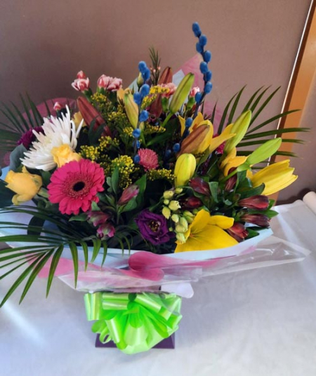 A colourful arrangement of seasonal flowers “bold n bright”, lovingly presented in a gift box with a bubble of water!